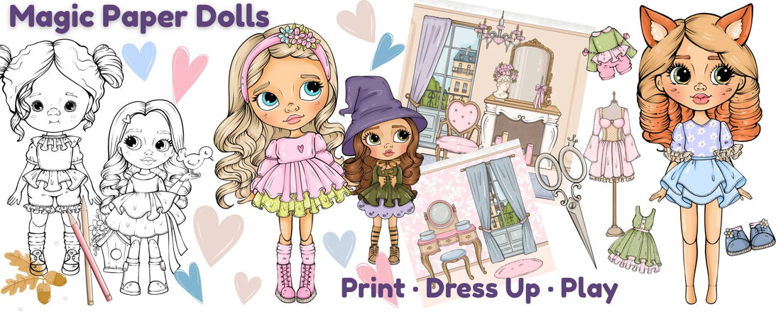 Unique PDF paper dolls with clothes and accessories. Print, cut & play – easy and fun for children.