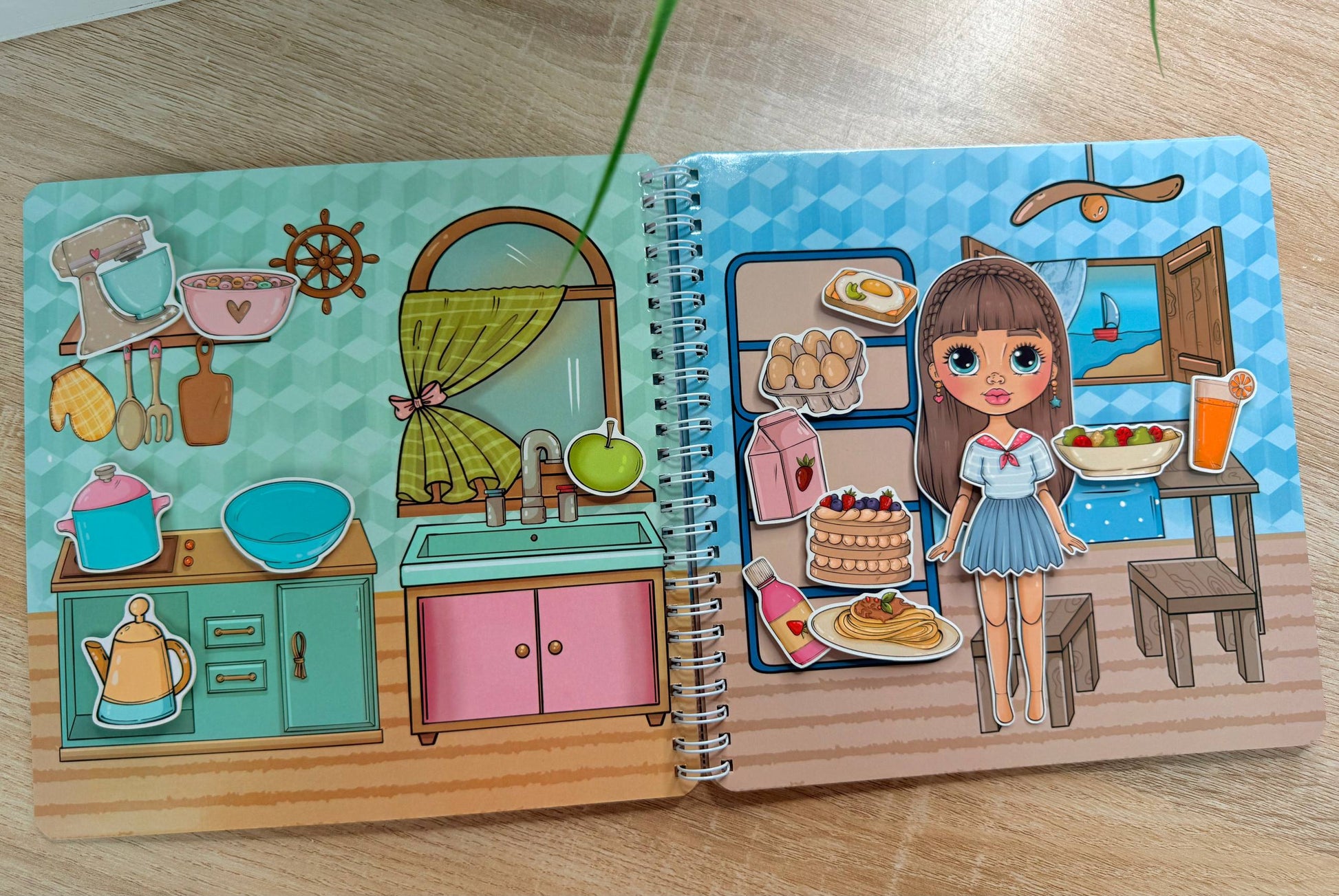 • paper dolls, coastal rooms (kitchen, bedroom, window to the sea), mix-and-match outfits, food & home accessories.