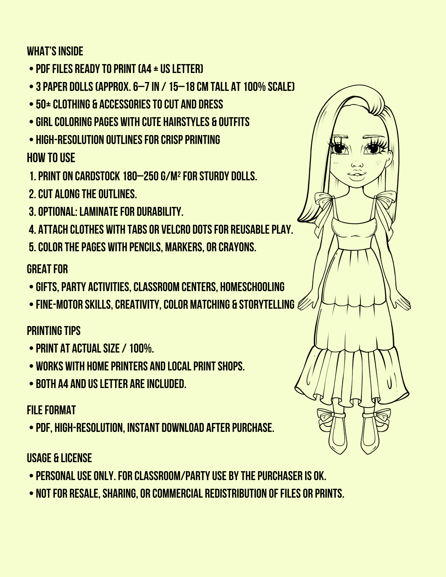 Bring fashion play to life! This printable bundle includes 3 stylish paper dolls and 50+ mix-and-match clothing pieces (dresses, tops, skirts, pants, PJs, shoes, cozy layers) PLUS coordinating girl coloring pages. Perfect for creative play, classrooms, party favors, travel kits, and quiet time.